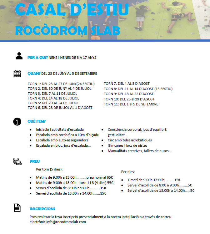 Per a nens i nenes de 5 a 15 anys. L’escalada els permetrà desenvolupar les seves habilitats d’equilibri, coordinació i superació personal. Practicaran l’escalada en bloc i amb corda i aprendran de forma segura a escalar combinant joc i esport..